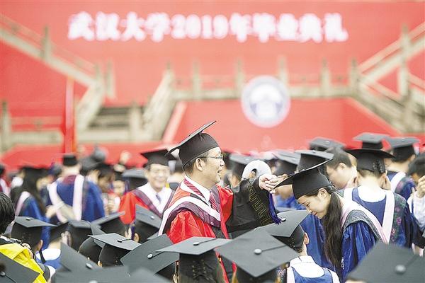 当日,武汉大学举行2019年毕业典礼暨学位授予仪式,导师们为参加典礼的一万余名毕业生一一扶正流苏,授予学位。新华社发