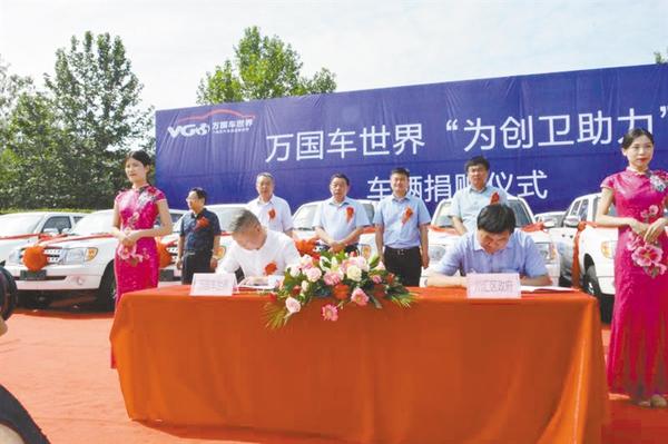 6月18日上午,万国车世界“为‘创卫’助力”捐赠车辆仪式在川汇区文化广场隆重举行。李宗喜、李湛、王保林、徐钊、梁显栋等区四个班子领导出席捐赠仪式。各办事处书记、分管副职,城管队员和万国车世界员工代表参加捐赠仪式。据了解,万国车世界此次向川汇区城管局捐赠20辆皮卡执法车和1辆消防车,价值近200万元,用于城市管理工作。②7记者 韩志刚 摄