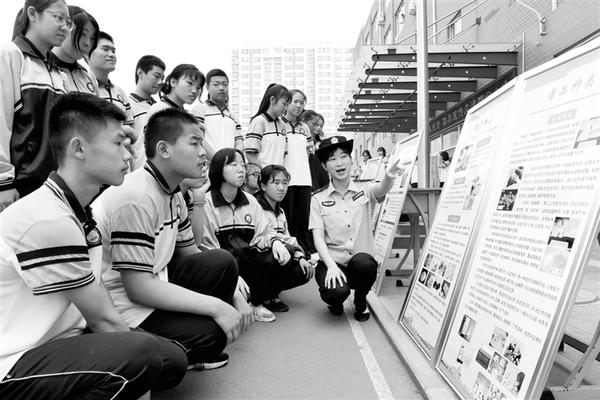 6月25日,邢台市强制隔离戒毒所民警为学生讲解禁毒知识。国际禁毒日前夕,河北省邢台市第八中学组织开展“健康人生 无毒生活”禁毒主题宣传活动,通过发放宣传资料、讲解禁毒知识、展示仿真毒品样品等形式,让学生认识到毒品危害,引导学生珍爱生命、远离毒品。新华社记者 朱旭东 摄