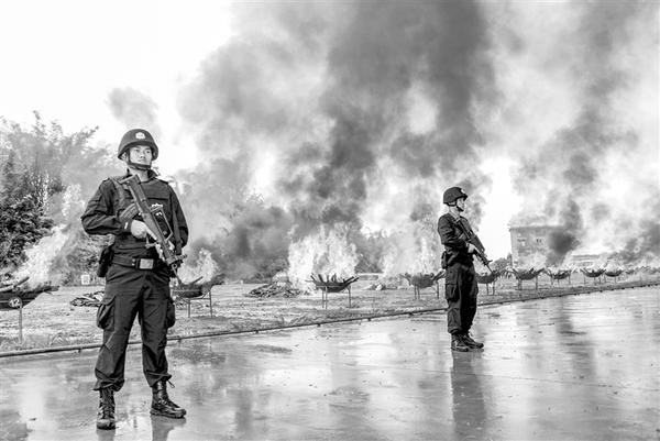6月26日,云南德宏公开销毁毒品。当日是国际禁毒日,云南省德宏傣族景颇族自治州在当地举行公开销毁毒品及禁毒宣传活动,现场销毁缴获的海洛因、冰毒、鸦片、吗啡、咖啡因等各类毒品6.92吨。新华社发