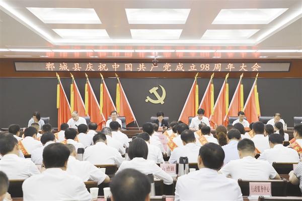 本报讯 (记者 徐松 通讯员 王璐 文/图) 6月28日,郸城县召开庆祝中国共产党成立98周年大会(如图)。会议回顾党的光辉历程,缅怀党的丰功伟绩,表彰先进基层党组织和优秀个人,进一步激励引导全县各级党组织和广大党员干部不忘初心、牢记使命、扎实工作,为全面建成小康社会而努力奋斗。县委书记罗文阁出席会议,并讲话。县委副书记、政法委书记崔卫国主持会议。县领导李建军、王伟、侯磊、王智华、马超、薛燕等参加会议。