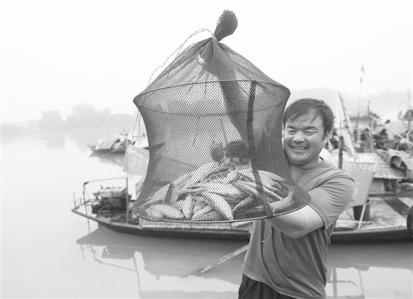7月1日,在东梓关村渔市码头,渔民展示刚捕捞上来的富春江江鲜。