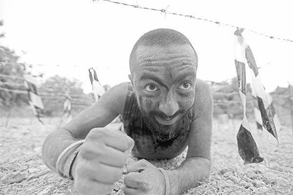 6月30日,选手在比赛中匍匐穿越铁丝网障碍。