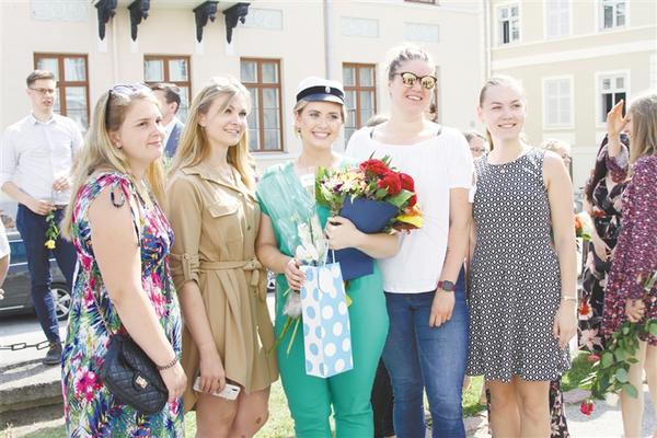 在爱沙尼亚东部城市塔尔图,塔尔图大学毕业生在毕业典礼上与亲友庆祝。