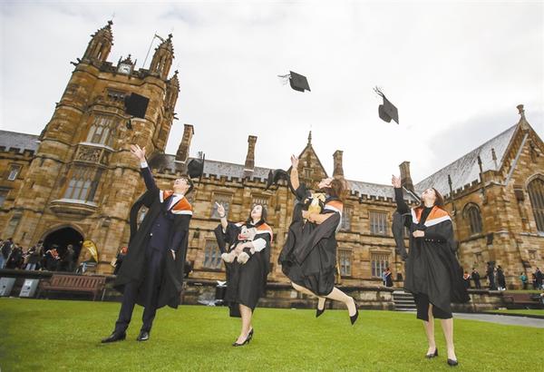 在澳大利亚悉尼大学,毕业生在毕业典礼上庆祝。