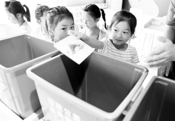 7月5日,合肥市包河区常青街道淝南社区小朋友在“垃圾分类”暑期小课堂上进行垃圾分类小游戏。当日,合肥市包河区常青街道淝南社区开展“垃圾分类”暑期小课堂,邀请包河区城管队员为辖区儿童讲解垃圾分类知识,增强孩子们的垃圾分类意识和资源节约意识。新华社发