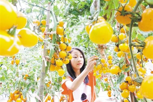 7月6日,在河南农大新品种实验基地,前来观光的游客正在采摘“青春之歌”西红柿。河南农大依靠科研和人才优势,在扶沟县蔬菜研究院建设蔬菜新品种研发和推广基地,每年培育新品种1000多个、推广400多个,使受益菜农增收15%以上。谷志方 摄