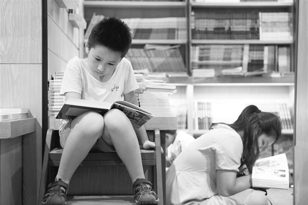 7月10日,小朋友在位于合肥市的安徽图书城里看书。