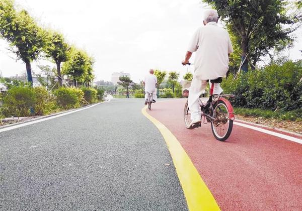 “本次改造提升在尽量不破坏原有景观框架的前提下,进一步完善公园的使用功能,达到方便服务周边居民休闲健身的目的。”据县住建局局长朱明介绍,此次提升的最大亮点是将公园进行 “海绵化”改造,将原有环湖路更换为透水彩色沥青铺装(如图2),又增设了多功能调蓄、生物滞留等“海绵化”设施。此外,公园水体改造为自然式驳岸,林间新铺设了木栈道,增加了景观照明、坐椅、垃圾箱等基础设施,并通过新建桥梁和景观廊亭等园林建筑小品及绿化补植,增强了公园整体绿化效果。