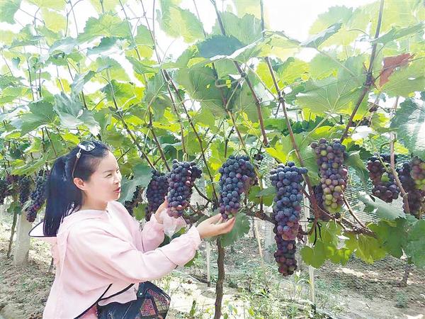 7月14日,沈丘县卞路口乡的一个生态采摘园里,一串串紫玛瑙般的葡萄挂满枝头。近年来,该乡利用“临207省道、离县城近”的交通优势,鼓励农民成立种植专业合作社,发展黄金梨、蜜桃、葡萄等水果采摘产业,采取“党支部+合作社+农户”的发展模式,带动群众增收致富。图为一名游客正在采摘葡萄。黄海涛 摄