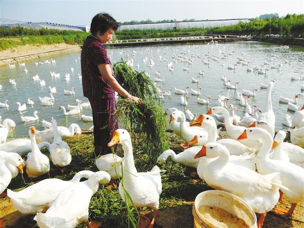 7月16日,沈丘县周营镇马营村生态鹅养殖基地,工人正在喂养生态鹅。近年来,该镇充分利用得天独厚的生态环境优势,积极引导群众发展订单生态土鸡、肉鹅、槐山羊等特色养殖产业,全力促进农民增收致富。谢辛凌 摄