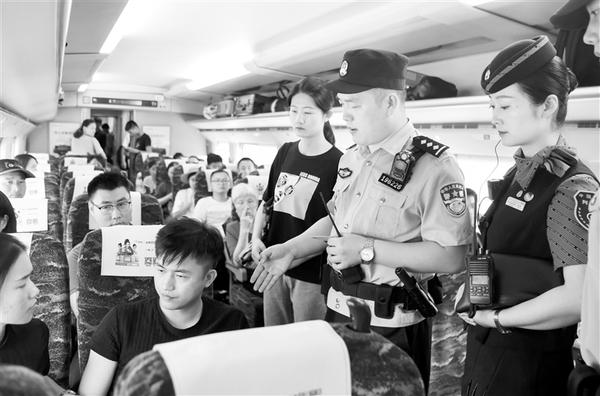 7月17日,武汉铁路公安局举行实地演练,针对影响群众安全感的列车霸座、扒阻车门、倒卖车票、醉酒滋事、拒绝安检、恶意逃票、毁坏站车设备、阻碍民警执法和妨碍铁路工作人员履行职务等社会治安问题和违法犯罪行为,展开规范化处置执法教学演练。新华社发