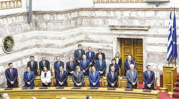 7月17日,在希腊雅典,总理米佐塔基斯(右一)与新一届议会议员出席宣誓就职仪式。当日,希腊举行新一届议会议员宣誓就职仪式。希腊7月7日举行议会选举,米佐塔基斯领导的新民主党赢得300个议会席位中的158席,米佐塔基斯于8日宣誓就任希腊总理。新华社发
