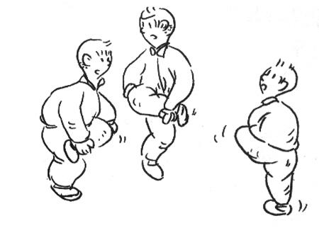 最费力的游戏是叨鸡。这是稍大些的男孩女孩在冬季玩耍取乐的游戏。其玩法是,两人对阵,每人将自己的一条腿抬起,用一只手扳住脚,另一只手扳住膝盖,形成金鸡独立架势,跳跃着前后左右移动。向对方攻击时,可用前曲的膝盖向上挑、向下压,或直接撞击。两人膝盖相斗,犹如两鸡叨架。如果谁被撞倒或扳起的那只脚着了地,即为失败。如果有三人以上参加游戏,可采用打擂台的方法向胜者挑战,谁撑到最后,谁就是胜利者。