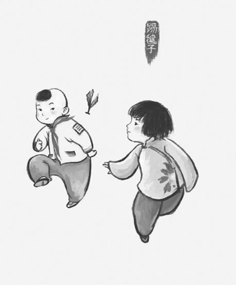 最优美的游戏是踢毽子。首先,要制作毽子。用两三个外圆内方的小铜钱,通过方孔,夹住一撮鸡毛的根部,用一小块布包住铜钱,再用线缝牢,毽子就做成了。鸡毛,要用公鸡尾巴上的毛,因为尾巴上的毛较长、柔软、多彩,好看又好踢。踢毽子,是男孩女孩冬天穿着大棉鞋开展的游戏。其踢法多种多样:一只脚踢、两只脚交换踢、转圈踢、背后踢、翻转踢……比赛时,可比踢的次数多、可比踢的花样多、可比踢的时间长……踢毽子,动作轻盈、灵巧、优美,很受孩子们的喜爱。