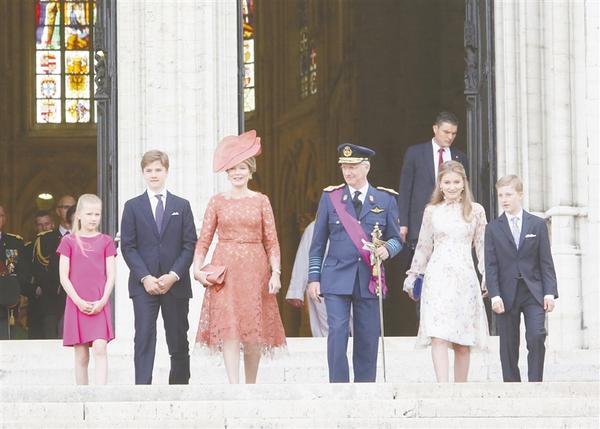 7月21日,在比利时布鲁塞尔,比利时国王菲利普(右三)、王后玛蒂尔德(左三)与大公主伊丽莎白(右二)、大王子加布里埃尔(左二)、小公主埃莱奥诺(左一)和小王子埃曼努尔(右一)参加国庆日庆祝活动。