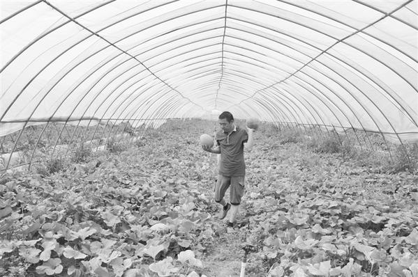 昨日,商水县大武乡农民刘书显在查看即将成熟的哈密瓜。刘书显在新疆生活了30多年,熟悉哈密瓜的生长过程,他结合当地气候,在本村采用大棚增温的方式种植哈密瓜24棚60多亩,喜获丰收,预计亩产六七千斤,将于7月底上市。记者 付永奇 摄