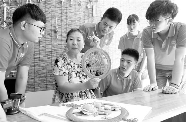 7月23日,在石家庄市长安区的国翠非遗馆,绳编老师给西安工业大学的大学生展示编织作品。近日,石家庄国翠非遗馆举办“暑期实践学非遗”系列活动,包括面塑、剪纸、脸谱制作、手工编织技艺等非遗项目吸引众多非遗爱好者前来参观体验,在炎炎夏日感受非遗文化,乐享暑期时光。新华社记者 骆学峰 摄