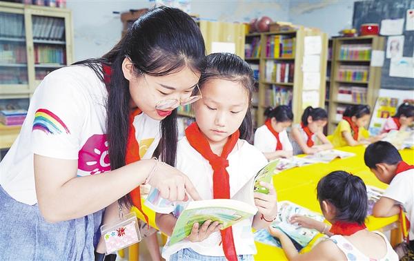 8月2日,青年志愿者(左一)在指导孩子阅读图书。