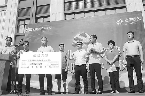 8月8日上午,商水建业城向新城办事处黄庄行政村捐款40万元,用于该村建设党群服务中心(村室)。该企业是商水本土企业,在做大做强的同时,不忘社会担当,积极参与社会公益慈善活动,3年来累计向社会捐款近百万元,受到社会各界好评。