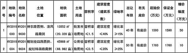 备注:(1)具体建设方案须报规划部门批准后实施,土地出让合同签订后,12个月内必须开工建设,工期30个月,土地成交价款需在土地出让合同签订后60日内缴清,交地时间6个月内。(2)HY2019030、HY2019034号宗地建筑要求:建筑物及构建筑物限高24米。(3)土地竞买保证金必须以竞买申请人(单位)自身的名义缴纳,竞买申请人(单位)与缴款人(单位)名称不一致的,无法确认其竞买资格,缴纳款项无效。(4)具体以规划部门出具的规划指标为准。