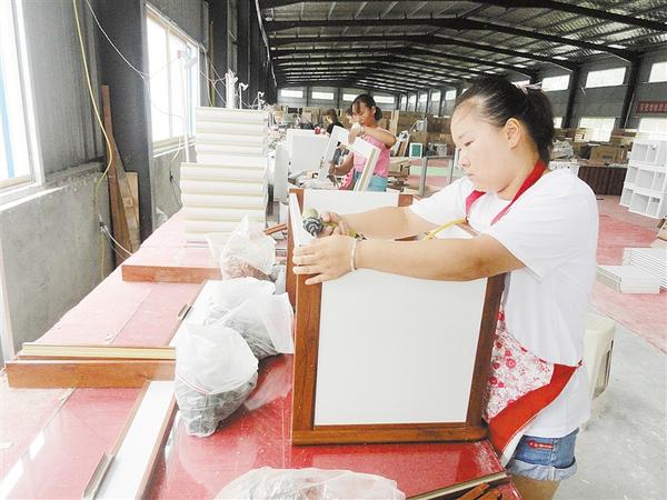 8月8日,商水县黄寨镇王老庄村贫困人员在村扶贫车间加工柜子。该镇创建6个扶贫车间,安排300多名留守妇女和贫困人员就业,月工资2000多元。乔连军摄