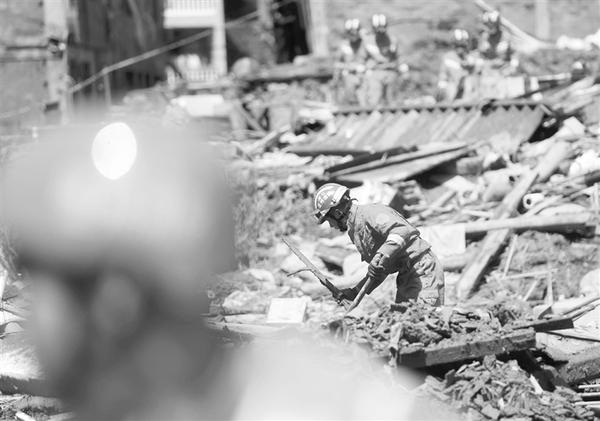 8月11日,救援人员在浙江永嘉岩坦镇山早村山体滑坡灾害现场继续搜救。