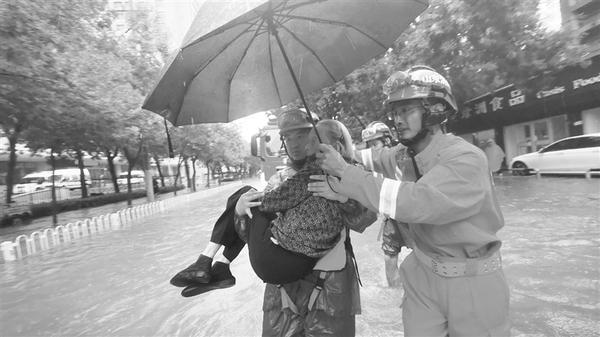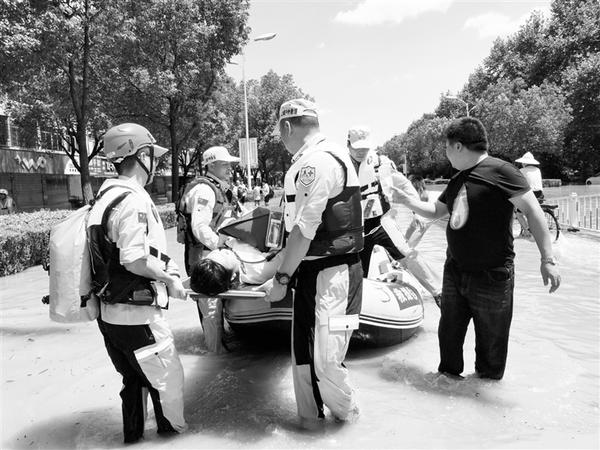 8月11日,救援人员在山东省滨州市滨城区一积水路段救助被困车内的九旬老人。