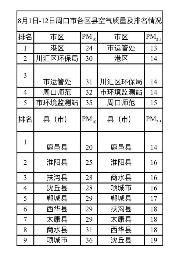 8月1日-12日周口市各区县空气质量及排名情况
