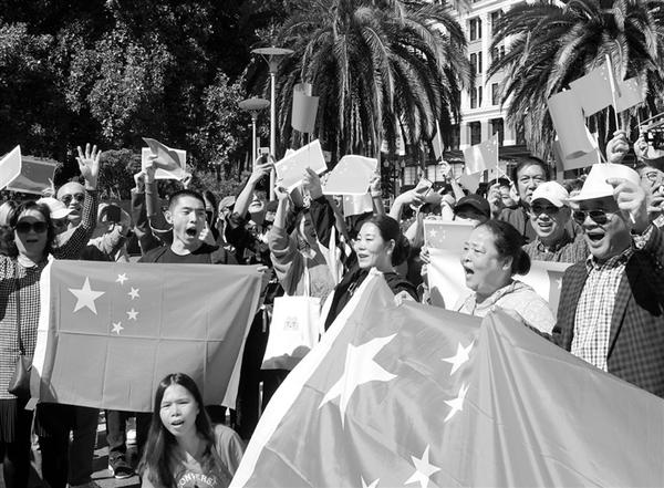 8月18日,在美国旧金山市中心联合广场,当地华侨华人自发举行和平集会,表达爱国爱港心声。新华社发