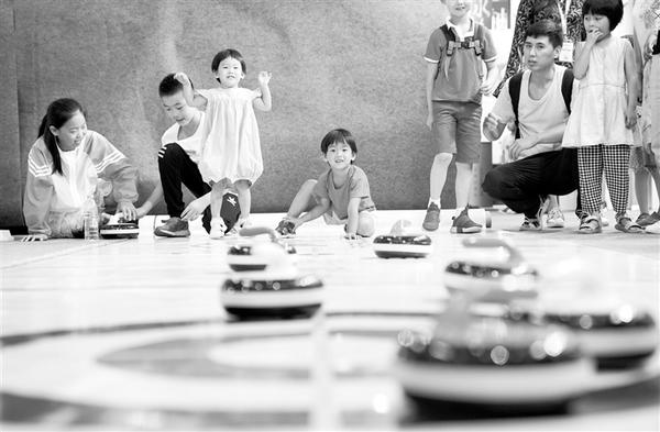 8月21日,观众在北京冬奥展区体验冰壶。当日,第二十六届北京国际图书博览会暨第十七届北京国际图书节,以及第九届中国数字出版博览会,在中国国际展览中心新馆开幕。新华社记者 金良快 摄
