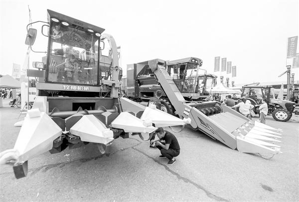 8月21日,农民在长春农博园农博会现场参观选购农机。当日,在第十八届中国长春国际农业·食品博览(交易)会现场,农机展区展出的各式农机吸引人们前来参观选购。新华社记者 张楠 摄