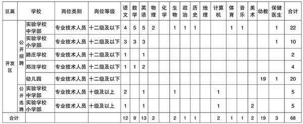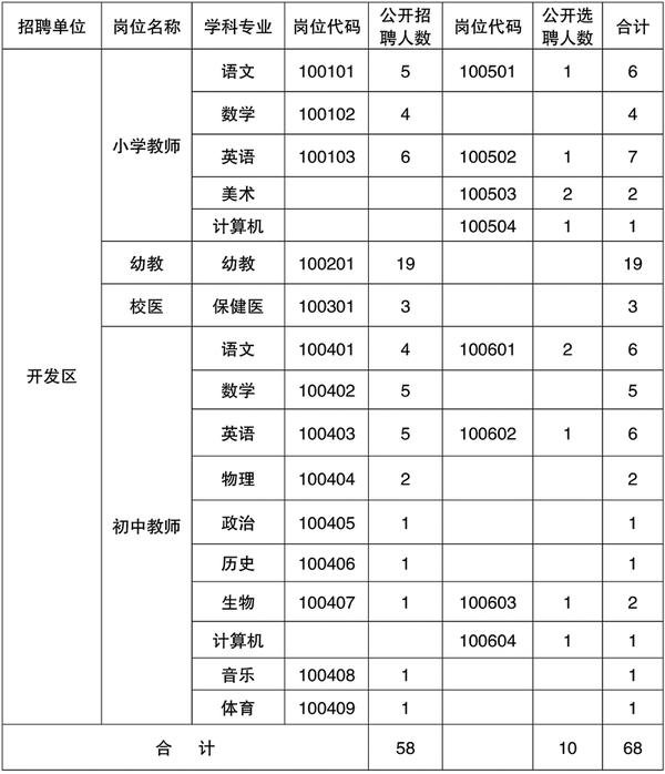 依据《周口市人力资源和社会保障局关于市直事业单位招聘工作人员有关问题的通知》(周人社〔2010〕114号)精神,结合开发区中小学教师紧缺状况,为进一步加强开发区区学校教师队伍建设,优化教师队伍结构,经开发区教育文化局研究,报开发区党委、管委会同意,决定面向社会公开招聘教师58名,选聘在编教师10名,并制订本方案。