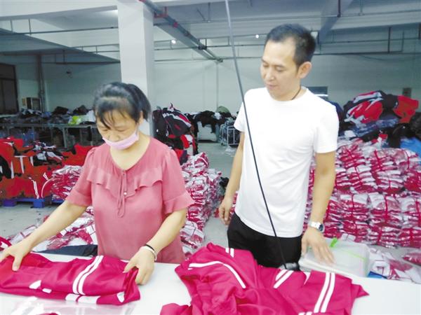 河南省华宇服饰有限公司位于太康县产业集聚区。该公司负责人王华伟致富不忘乡亲,多年来坚持为太康、沈丘等地的聋哑学生免费制作校服。他多年如一日坚持做公益的善举赢得社会各界一致好评。图为王华伟(右一)到车间查看校服制作情况。记者 马治卫 摄