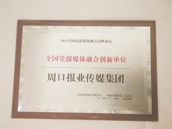 本报讯 (记者 王伟宏 岳建辉 文/图) 日前,从在昆明召开的“壮丽70年 奋斗新时代——2019年全国党报媒体融合高峰论坛暨社长总编看昆明”活动现场传来喜讯,周口报业传媒集团被评为“全国党报媒体融合发展创新单位”(如图)。
