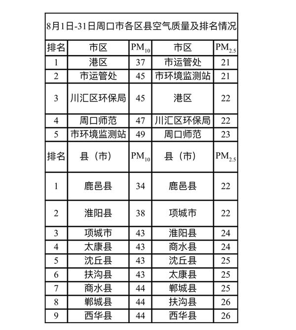 8月1日—30日周口市各区县空气质量及排名情况
