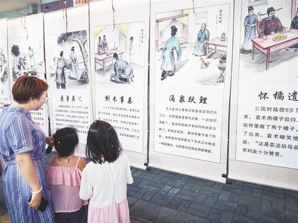 高常忠,扶沟人,省美术家协会会员。他深受孝文化的熏陶和影响,历时一年,创作出24幅绘画作品,每一个孝道典故都与一幅绘画作品相对应。典故耳熟能详,耐人回味;绘画作品笔墨细致,功底深厚。图为一名家长带孩子观展,接受传统文化熏陶。