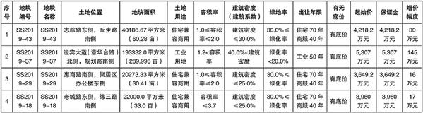 挂牌报价时间为:SS2019-43地块:2019年10月8日9时至2019年10月18日10时30分;SS2019-37地块:2019年10月8日9时至2019年10月18日10时20分;SS2019-29地块:2019年10月8日9时至2019年10月18日10时10分;SS2019-18地块:2019年10月8日9时至2019年10月18日10时。