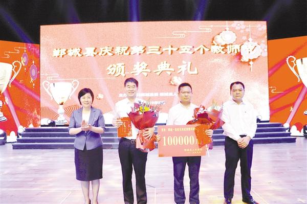 本报讯(记者 徐松 文/图) 9月6日,郸城县庆祝第35个教师节颁奖典礼在县人民会堂举行。县委、县政府斥资600余万元重奖教育功臣,助推郸城教育再创辉煌。县委书记罗文阁、县长李全林和县四个班子其他领导,县直各单位、各乡镇负责人及教育系统全体职工共1400余人参加颁奖典礼。罗文阁、李全林为教育功臣颁奖(如图)。