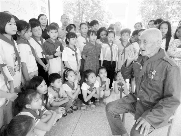 9月11日,曾参加抗美援朝、荣获“二级英模”称号的商水县黄寨镇杨营村87岁复员军人李叶民在杨营村小学给同学们讲战斗故事。据了解,李叶民已坚持30年对学生进行红色革命教育。乔连军 摄