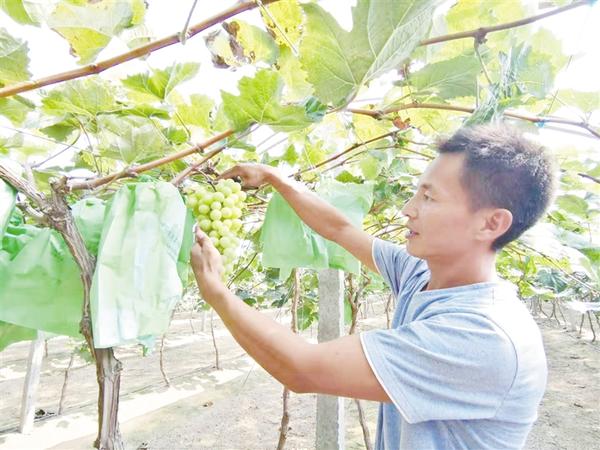 西华县迟营乡杨楼村村民李玉柱从部队转业后,放弃在县城工作的机会,回老家承包了30多亩地发展葡萄种植,每年盈利20多万元。图为李玉柱采摘葡萄。记者 张猛 摄