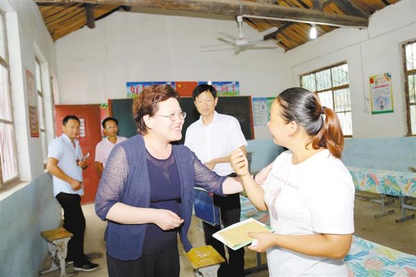 9月10日是第35个教师节。当天,县长张颖波一行来到白潭镇小岗杨村小学、尹郭村小学等学校,查看乡村学校办学条件,看望坚守教育一线的教师,帮助解决农村教育存在的问题和困难,和一线教育工作者共商扶沟教育发展大计,勉励他们继续葆有热爱教育的定力、淡泊名利的坚守,争做有理想信念、有道德情操、有扎实学识、有仁爱之心的最美乡村教师和出彩乡村教师,把更多的农村孩子培养成为党和国家需要的人才。图为张颖波和教师代表亲切交流。 记者 谢永静 通讯员 纪俊辉 摄