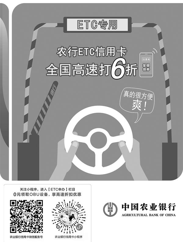 凡农行ETC信用卡客户,注册并登录农行掌上银行,每月可领取ETC通行费月票,自领取之时起享受当月ETC高速通行费6折优惠,最高可优惠30元,月票数量有限,先到先得。2019年12月31日前,使用农行ETC信用卡还可享受1元洗车、车辆保养、酒店住宿、美食半价等优惠。