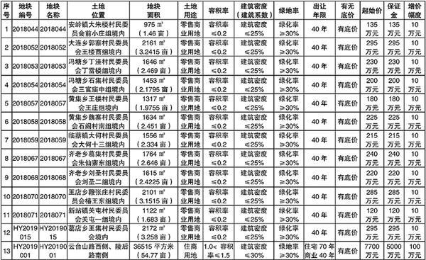 备注:①具体建设方案须报规划部门批准后实施,土地出让合同签订后,12个月内必须开工建设,工期30个月,土地成交价款需在土地出让合同签订后60日内缴清,交地时间6个月内。②2018044、2018052、2018053、2018054、2018057、2018058、2018059、2018067、2018068、2018070、2018071、HY2019015,12宗地建筑要求:建筑物及构建筑物限高9米,层数≤2层。③HY2019001建筑物限高24米,可兼容商业建筑面积比例不大于10%。④土地竞买保证金必须以竞买申请人(单位)自身的名义缴纳,竞买申请人(单位)与缴款人(单位)名称不一致的,无法确认其竞买资格,缴纳款项无效。⑤具体以规划部门出具的规划指标为准。