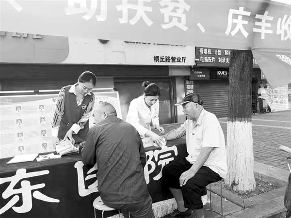 近日,周口豫东医院在扶沟县委大院门口举行“服务百姓 健康行动”义诊活动。活动现场,医护人员为群众测量血压,发放健康教育宣传资料,并针对群众提出的有关健康方面的问题,一一进行解答。此次活动增强了群众的预防与保健意识,受到群众的一致好评。记者 史书杰 摄