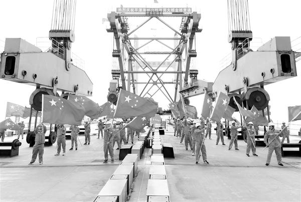 9月25日,中铁大桥局的建设者在平潭海峡公铁大桥施工现场欢庆大桥成功合龙。