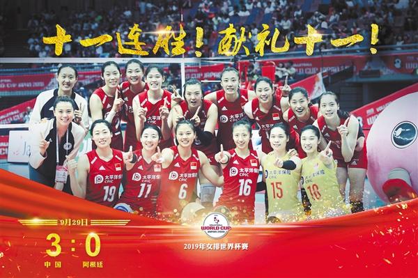9月29日,在日本大阪举行的2019年女排世界杯赛第三阶段A组循环赛中,中国队以3比0战胜阿根廷队,成功卫冕。