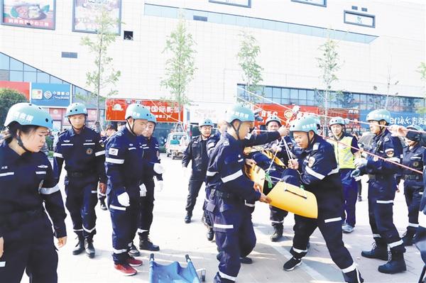 本报讯(记者 徐松 文/图) 9月27日上午,郸城县在府东路与科技大道交叉口附近的润商购物广场举行安全生产事故综合应急救援演练(如图)。应急管理、公安、消防、医疗、商务、生态环境、住建、交通、电力等部门近千人参加演练。