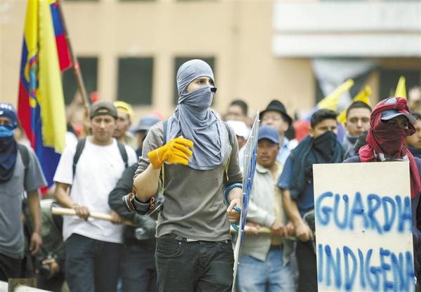 10月9日,在厄瓜多尔基多,示威者参与游行。当日,在厄瓜多尔首都基多,示威者向总统府所在的城区行进,警方设置路障用以阻挡,双方形成对峙。日前,厄宣布取消对汽油等燃油的价格补贴,这一措施导致油价大涨并引发民众强烈不满。为抗议政府放开汽油价格,厄交通运输业者3日举行全国大罢工。总统莫雷诺3日宣布全国进入为期60天的紧急状态,以应对厄公共交通行业宣布罢工给社会造成的混乱状况。莫雷诺7日宣布,鉴于当前首都基多的安全局势愈发紧张,厄政府机关将从基多临时迁至厄瓜多尔第一大城市瓜亚基尔。新华社发