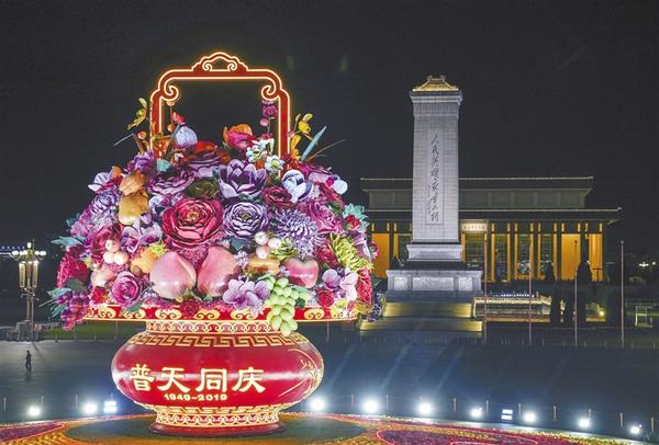 连日来,以“花果篮”为主造型的天安门广场中心花坛,吸引了众多游客参观拍照。“花果篮”的夜景更是流光溢彩,绚烂迷人。图为10月14日拍摄的天安门广场中心花坛。